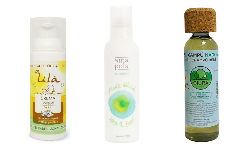 Tres ejemplos de productos para bebés. La crema para zonas delicadas de Lilà; el aceite natural de Amapola Bio Cosmetics y el gel champú de la firma Giura